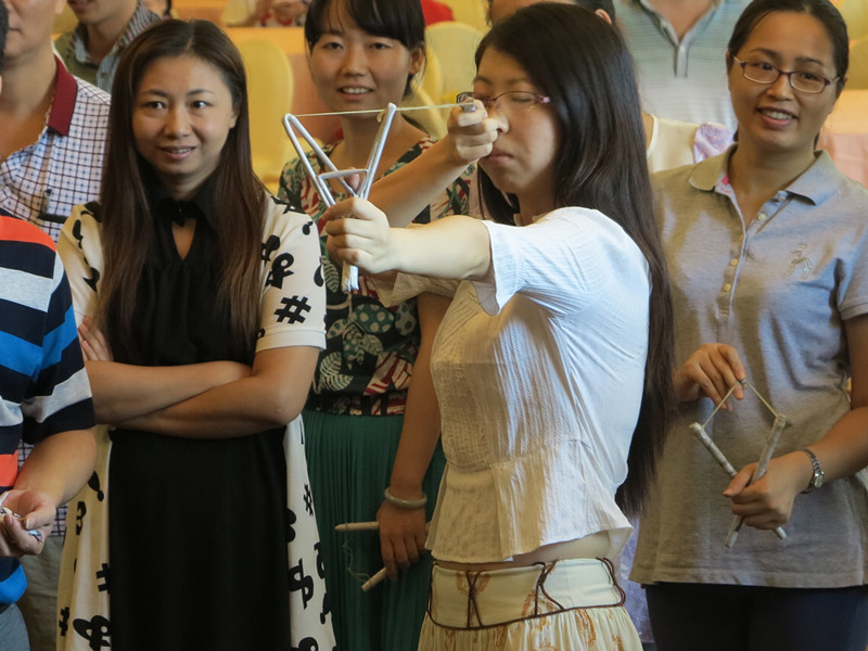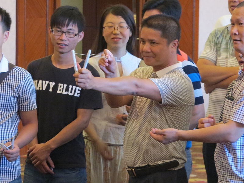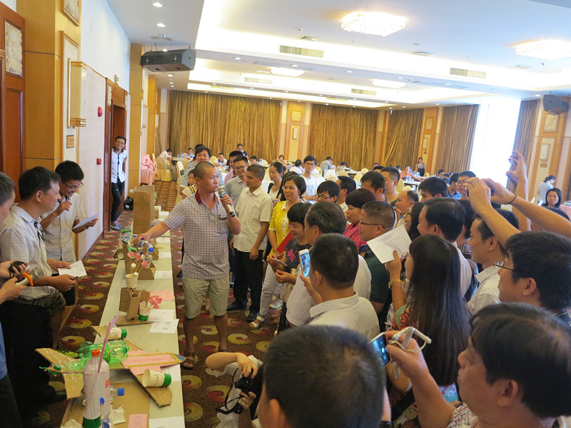 专题讲座环节,大家基本了解科技教育游戏的发展,掌握科技教育游戏设计的要点。游戏体验板块,参训人员团队完成了弹弓穿环、鲜美糖面和变废为宝等3个材料来源方便、制作成本低廉的科技教育游戏。全省首创新游戏——弹弓穿环要求只用报纸、橡皮筋和透明胶制作纸质弹弓(限重40克)和纸弹,男女两名组员在不同距离弹射穿环,看谁穿得准。弹弓穿环游戏不但考究大家的动手设计能力,而且考验弹射者的力量和眼力。鲜美糖面游戏利用适量的棉花糖和意大利面条搭建一个模型,比试高度。松软的棉花糖味道鲜美,但与细细的意大利面条“搭档”,构建一个尽可能高的模型实在不容易。变废为宝只用矿泉水瓶、纸皮等废旧材料制作一个工艺品或创意作品,考试大家的艺术创作和动手能力。2个小时里,大家既紧张又快乐,充分体验了这些融科技、艺术与体育于一体的科技游戏的神奇魅力。