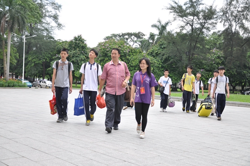 高校科学营广东营设中山大学分营(下称中大分营)、华南理工大学分营(下称华工分营)。14日的羊城,蓝天白云,艳阳高照,晴热的天气丝毫没有阻挡住从各省区远赴参营营员的热情。在华工分营,参加该校化学营的来自广东省汕尾市陆丰龙山中学的共十名营员在该校带队老师胡新强的率领下,于中午十二时许顺利抵达华工分营,师生一行在华工分营志愿者热情引导下先后办妥报到手续,领取营员手册、饭票、营服等物资,用午餐,并入住宿舍,从报到到入住,一路顺畅。