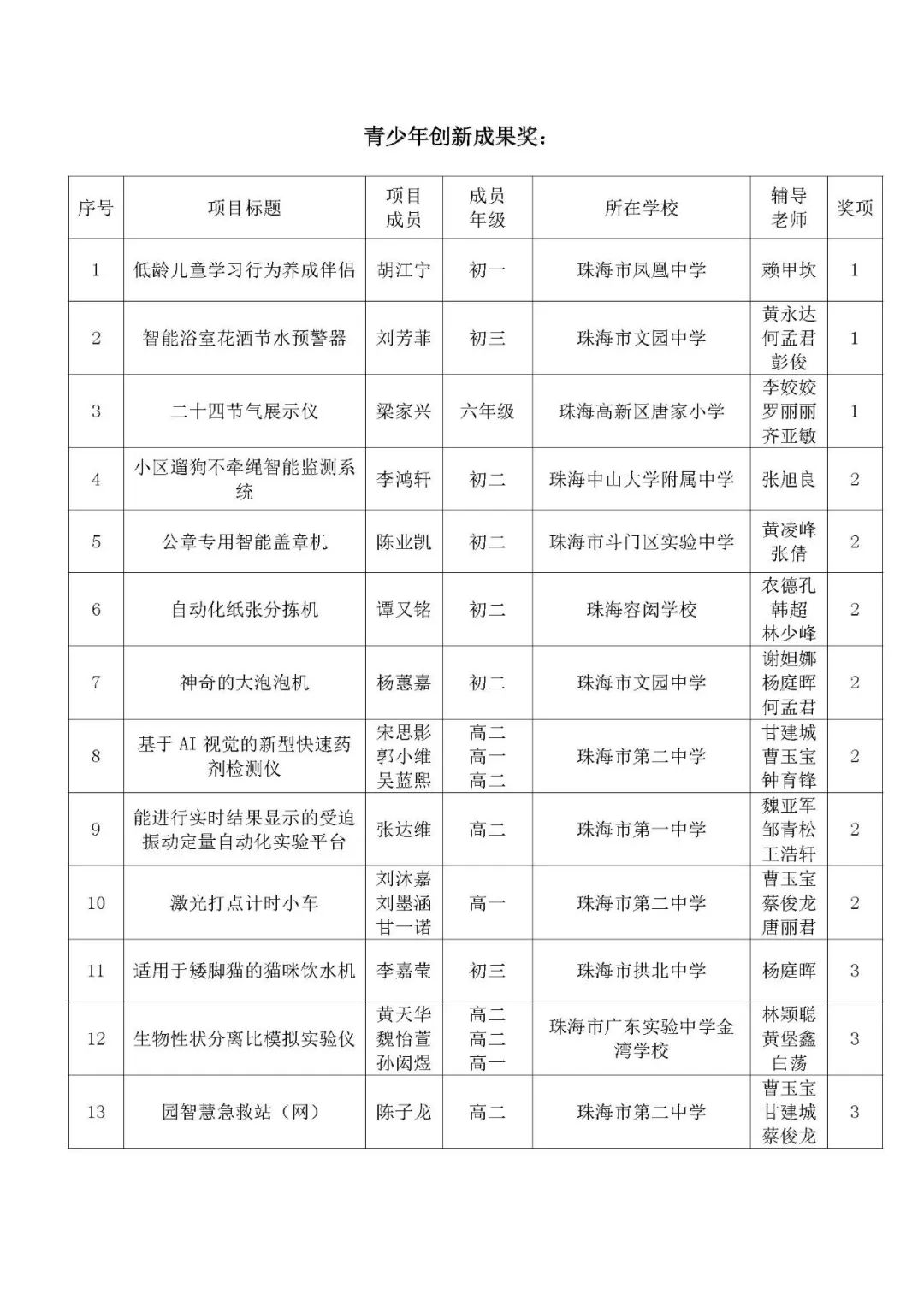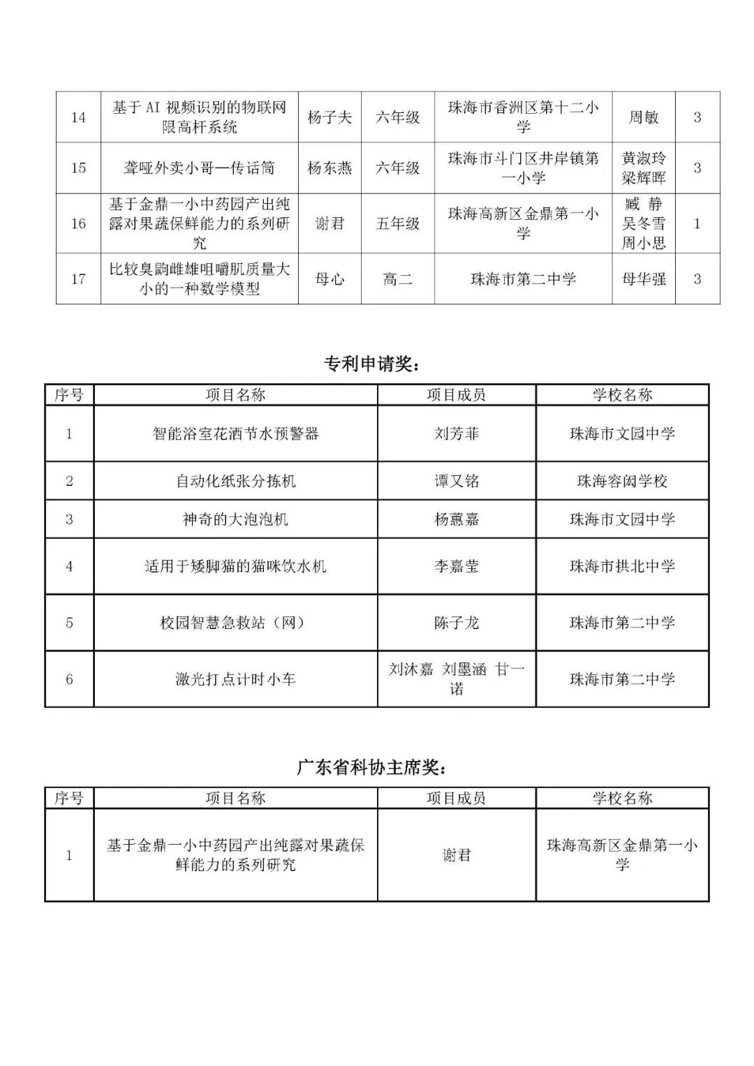 珠海高新区金鼎第一小学的谢君同学凭着“基于金鼎一小中药园产出纯露对果蔬保鲜能力的系列研究”取得大赛一等奖并荣获大赛专项“广东省科协主席奖”;珠海市凤凰中学胡江宁同学的作品“低龄儿童学习行为养成伴侣”和珠海高新区唐家小学梁家兴同学的作品“二十四节气展示仪”还被省组委推荐参加全国青少年科技创新大赛。