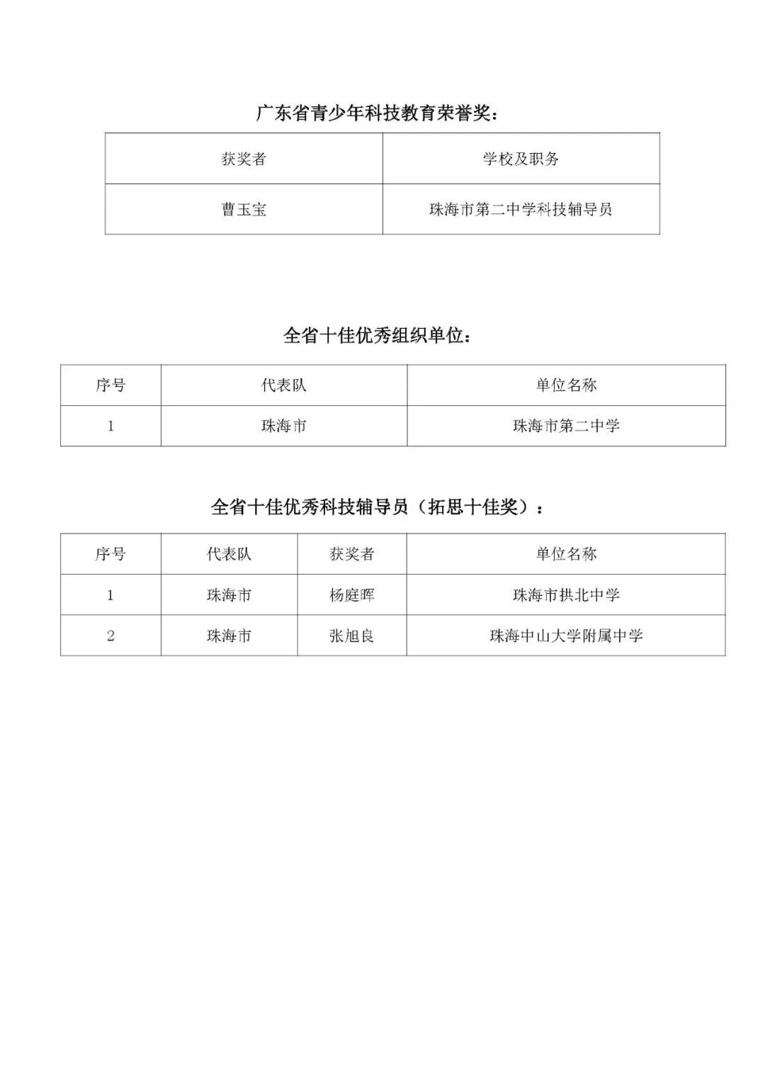 此外,本届大赛上,我市更多选手也是成绩斐然:珠海市第二中学的曹玉宝老师获得“广东省青少年科技教育荣誉奖”,是继原南屏中学何忠亮校长之后我市获得该殊荣的第二人;珠海市拱北中学的杨庭晖和珠海中山大学附属中学的张旭良获得“全省十佳优秀科技辅导员(拓思十佳奖)”。珠海市第二中学同时斩获“全省十佳优秀组织单位”。
